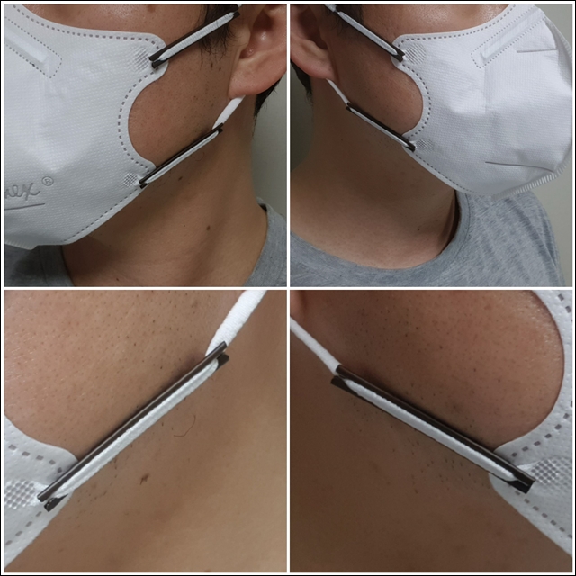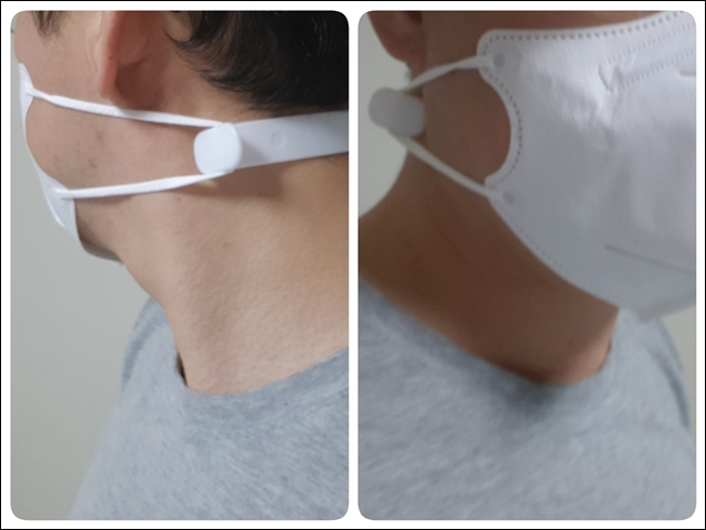 위와 같이 연결할 경우 마스크 끈 조절기에 피부에 따라 닿지 않아 편하게 사용 가능하며, 마스크 끈 뒷부분이 타이트하지 않고 자연스럽게 귀에 착용이 가능하여 이 또한 편리합니다.