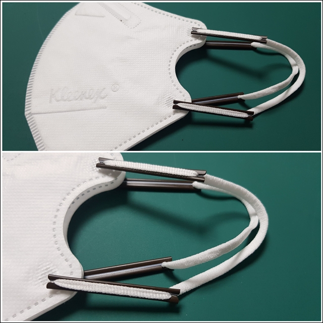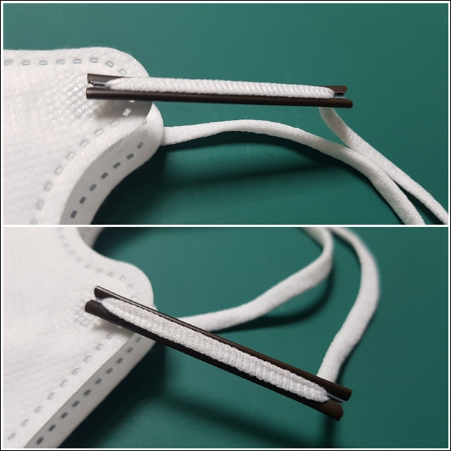 마스크 끈을 늘려주는 만큼 마스크 끈의 길이가 차이가 나는 것을 보실 수가 있습니다.