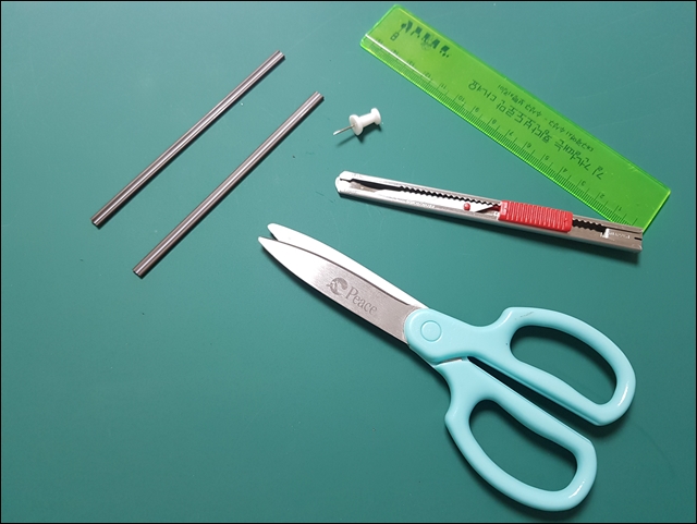 커피스틱 긴 거 2개, 칼, 가위, 자, 손잡이가 있는 압정을 준비해 주세요.