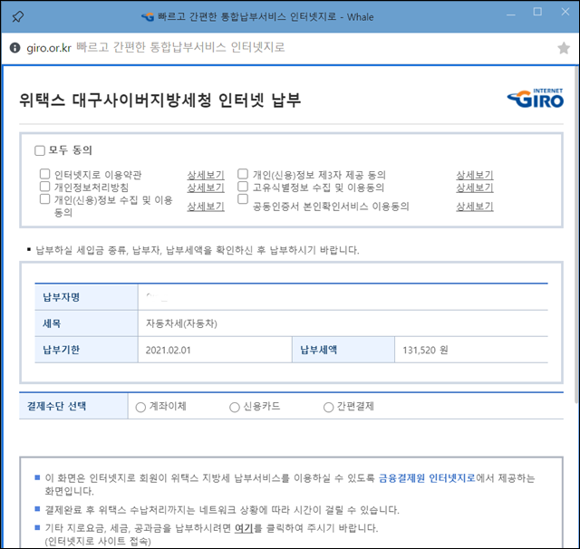 | 이번엔 인터넷지로에서 자동차세 연납 납부할거다! (0) | 2021.01.20 |