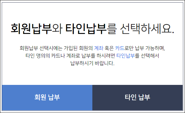아래와 같이 회원납부와 타인납부를 선택하라고 나옵니다.