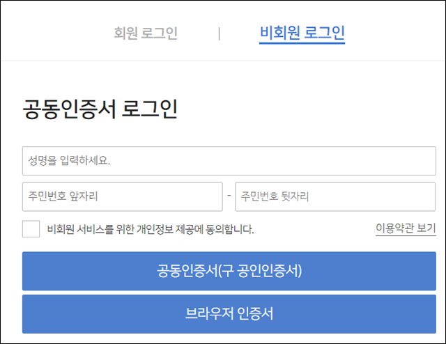 위택스에 회원가입을 따로 진행을 안할 경우에는 아래와 같이 비회원 로그인을 통해서 접속하셔도 납부가 가능하겠습니다.