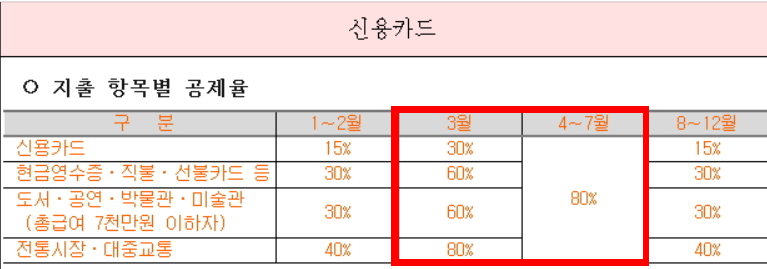 3월에는 기존대비 2배의 공제율을 적용하였으며, 4~7월까지 총 4개월간 신용카드 등으로 소비한 품목에 대해서는 카드 종류가 상관없이 모두 80%의 공제율을 적용하였습니다.