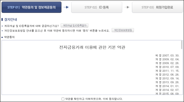 첫번째 단계입니다. 위와 같이 약관 동의 화면입니다. 약관 동의할 내용들을 확인해 주신 후 일일이 하나씩 동의를 선택해 주신 후 다음 단계로 진행하시면 되겠습니다.