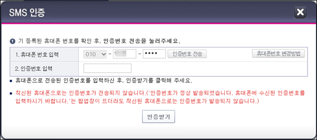 위와 같이 휴대폰 번호가 입력되고, 휴대폰으로 날아온 인증번호를 입력해주도록 하겠습니다. 그런 다음 인증받기를 선택해 주도록 하겠습니다.
