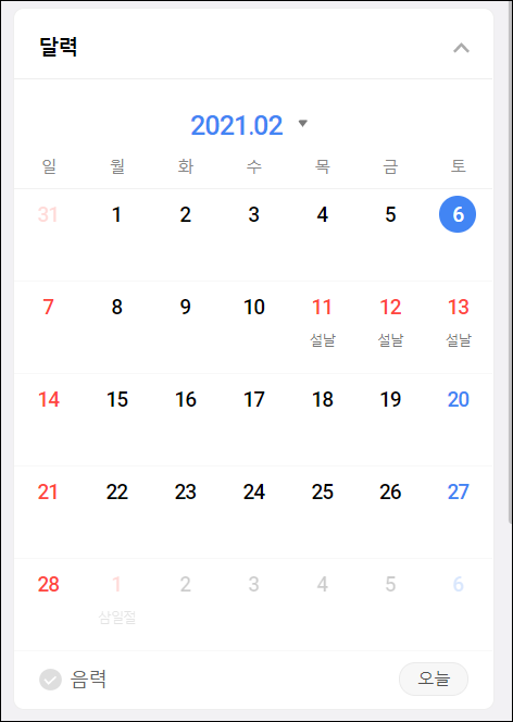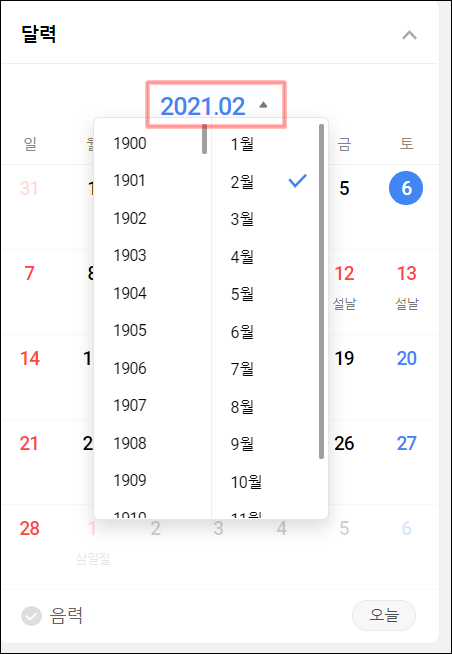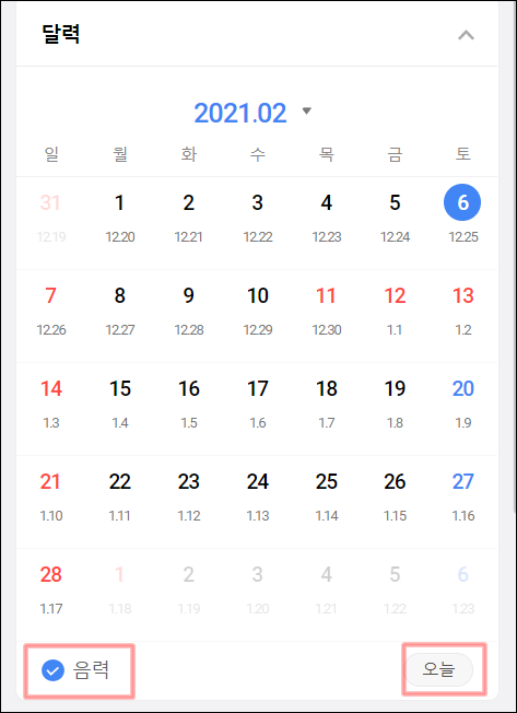다른 년도 다른 월을 위와 같이 바로 한 번에 선택해서 들어갈 수 있는 장점과 아래의 화면과 같이 음력을 선택하면 해당 일자 바로 아래에 음력을 보여주는 기능을 제공해 주고 있습니다.