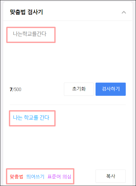 위와 같이 맞춤법 검사기에다가 글자를 입력하니 바로 아래에 올바른 문장을 바로 보여주네요. 복사해서 활용하도록 기능이 구현되어 있어 편리한 환경을 구축해놨습니다.