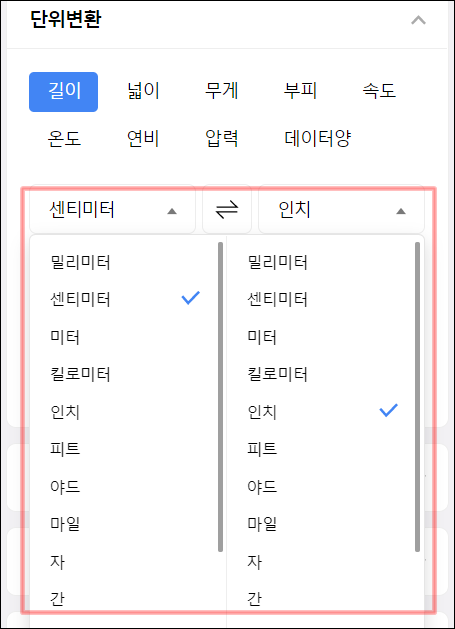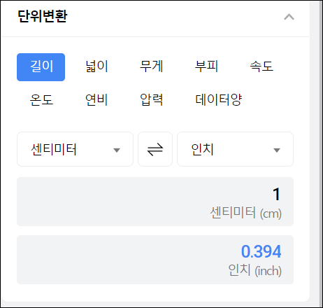 보통 포털사이트에서 "단위 변환"이라고 검색하면 단위들을 변환하는 창이 뜨는데, 이 사이드바를 활용해서 바로 단위 변환이 가능하니 조금 더 편리하겠어요.