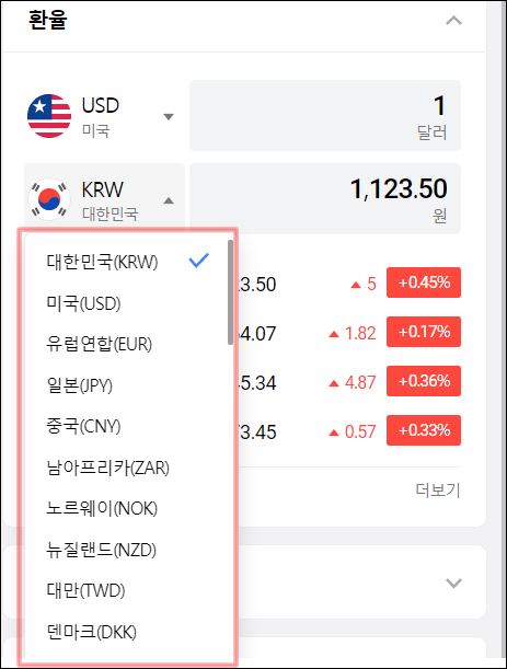 환율 정보를 선택하면 다양한 나라의 화폐단위를 우리나라 "원"이나 다른 나라 화폐로 환율에 따라 가격을 확인할 수 있습니다.