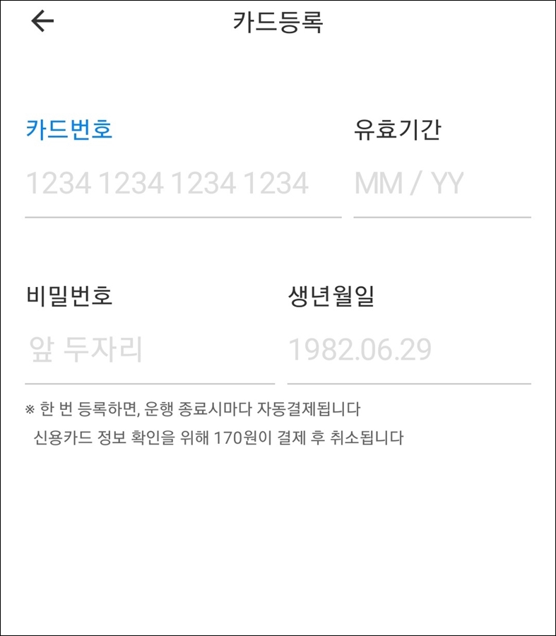 카드 정보 또한 아래와 같이 입력하라는 대로 기본 카드 정보를 입력하면 등록이 간단히 완료됩니다.