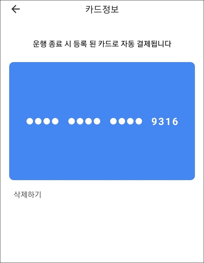 그다음 해야 할 것은 사용 요금을 결제할 카드정보를 입력하는 것입니다. 지쿠터에서 사용 전 태크, 사용 후 태그를 통해 결제를 하는 것으로 아래와 같이 카드 정보를 미리 입력해 놓아야 하겠습니다.