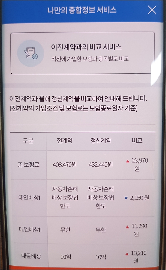 매년마다 자동차 보험료가 올라가다보니 다이렉트 보험도 역시 계속 조금씩 올라가는 느낌입니다. 위와 같이 올라간 금액을 보면 대인배상과 대물 배상 금액이 조금씩 상향되었네요.