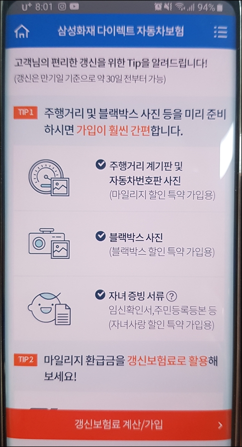 갱신을 하기 위해서는 위와 같이 자동차 번호판 사진 및 주행 거리, 블랙박스 사진 등이 필요합니다. 아래에서도 살펴보겠지만 할인을 받기 위해 필요한 사항들이니 참고해주세요.