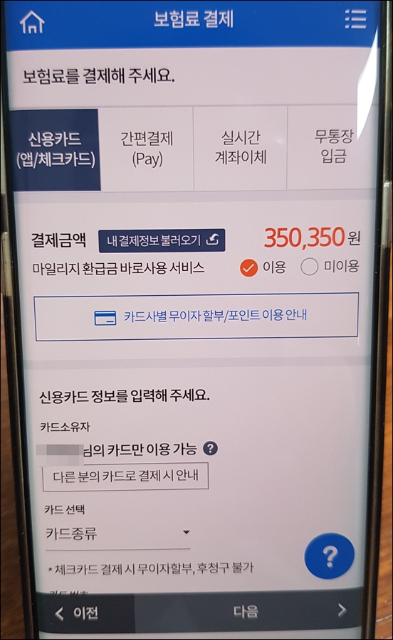 정보 확인이 모두 완료되었다면 피보험자 정보를 입력하고 난뒤 신용카드나 간편 결제, 실시간 계좌 이체 등을 통해 결제를 완료하면 되겠습니다.