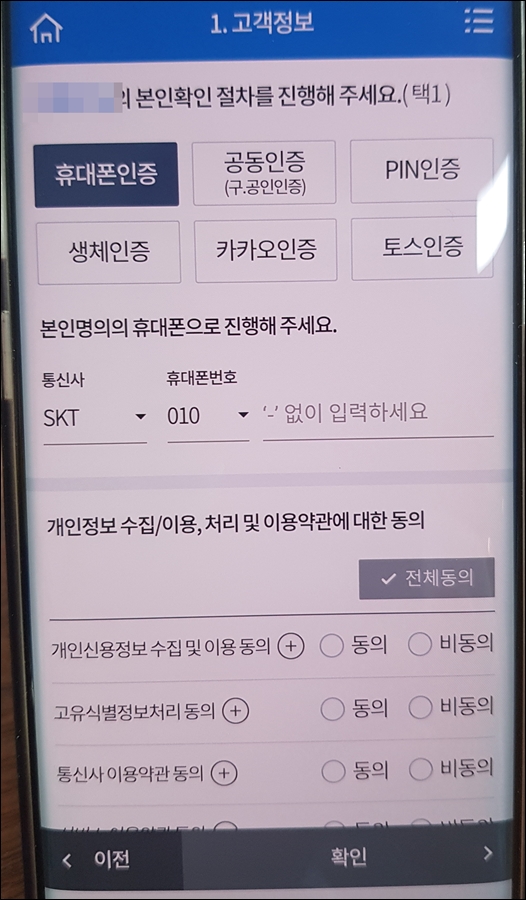 가입자 정보를 확인하기위해 개인 정보를 입력한 후 고객정보를 입력하여 고객 정보 확인 절차를 진행해 봅니다.