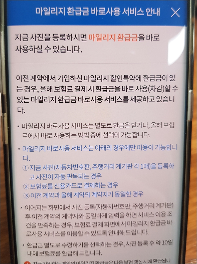 위와 같이 주행거리 사진을 올리면 됩니다. 샘플 사진 참고하셔서 등록을 하면 되겠어요. 이렇게 등록해서 할인되는 금액이 있으면 바로 갱신하는 자동차 보험에 적용해서 할인을 즉시 받을 수 있습니다.